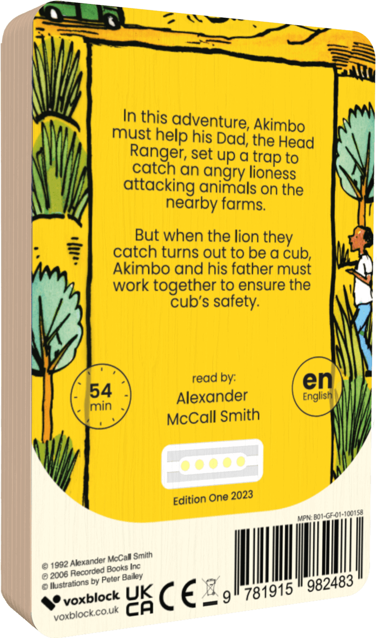 Listen to the Akimbo series by best-selling children's author Alexander McCall Smith. In this adventure, Akimbo must help his Dad, the Head Ranger, set up a trap to catch an angry lioness attacking animals on the nearby farms.But when the lion they catch turns out to be a cub, Akimbo and his father must work together t