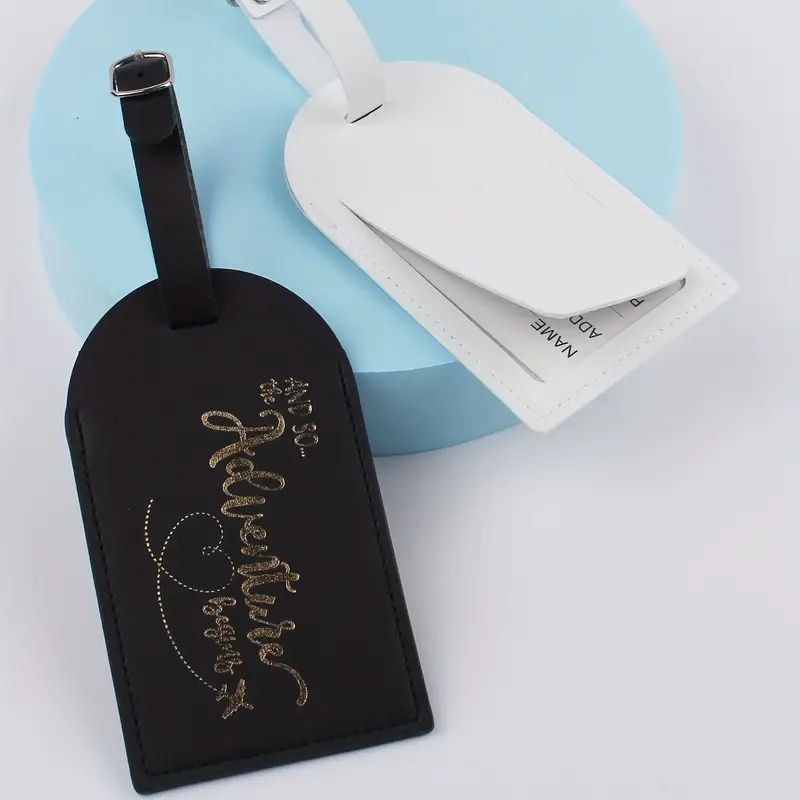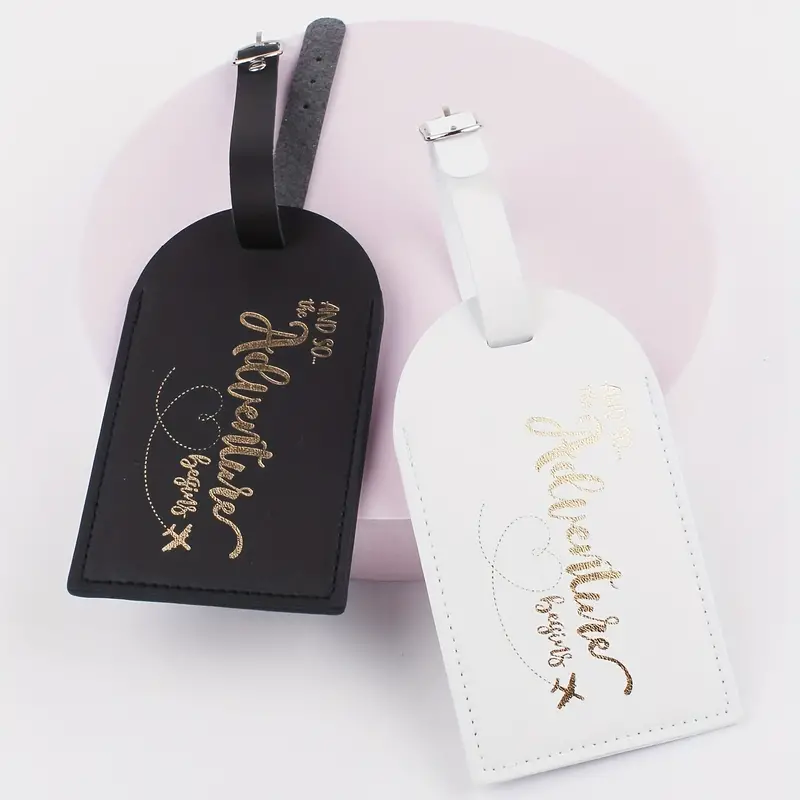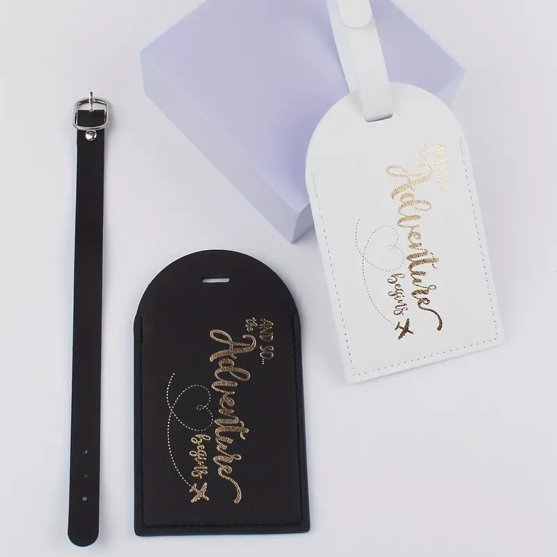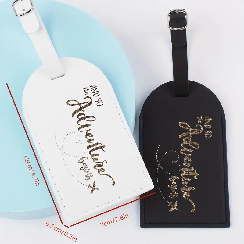 'And So The Adventure Begins' Faux Leather Luggage Tags Each tag measure 7cm W x 12cm L Material: Faux Leather