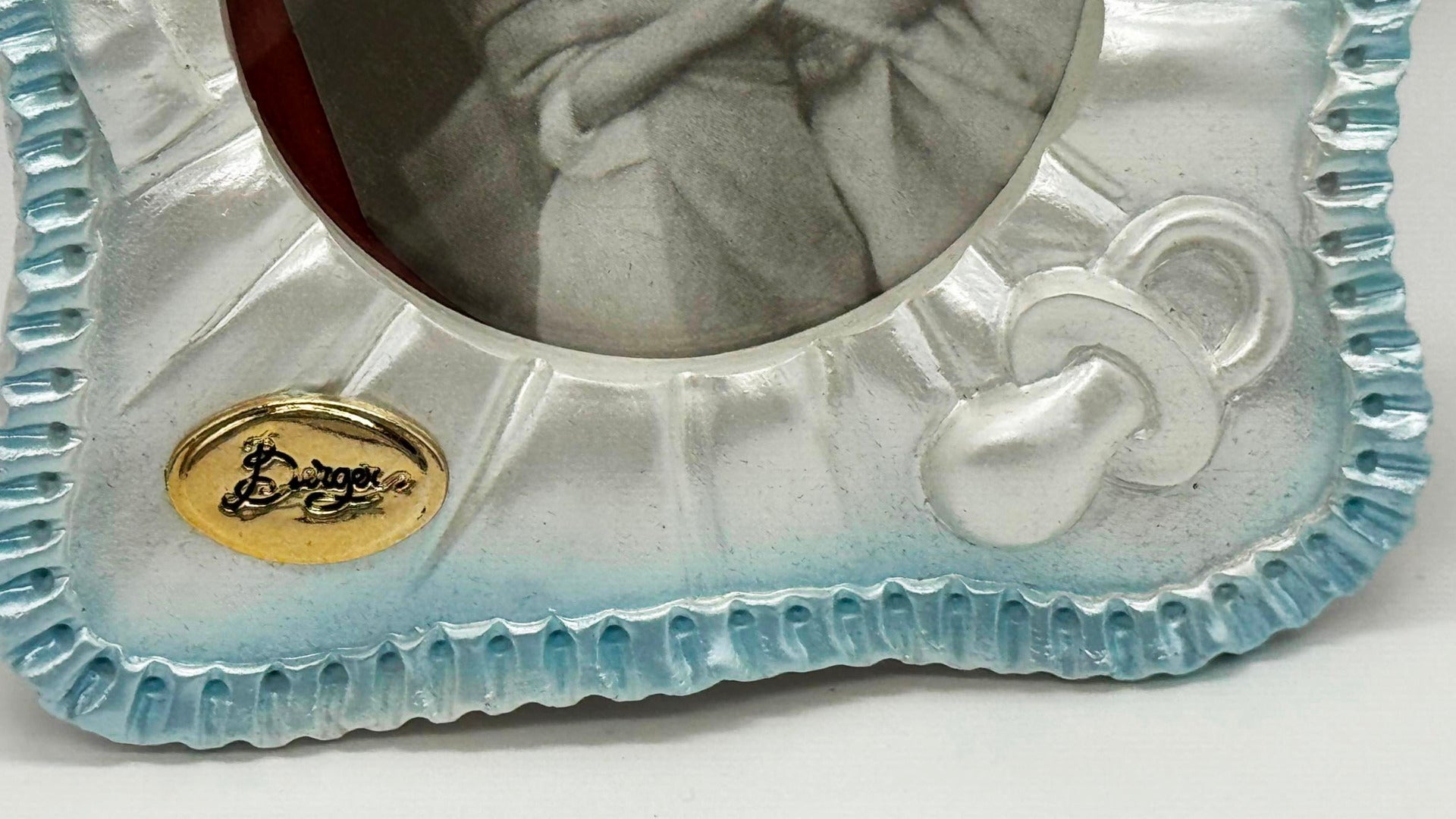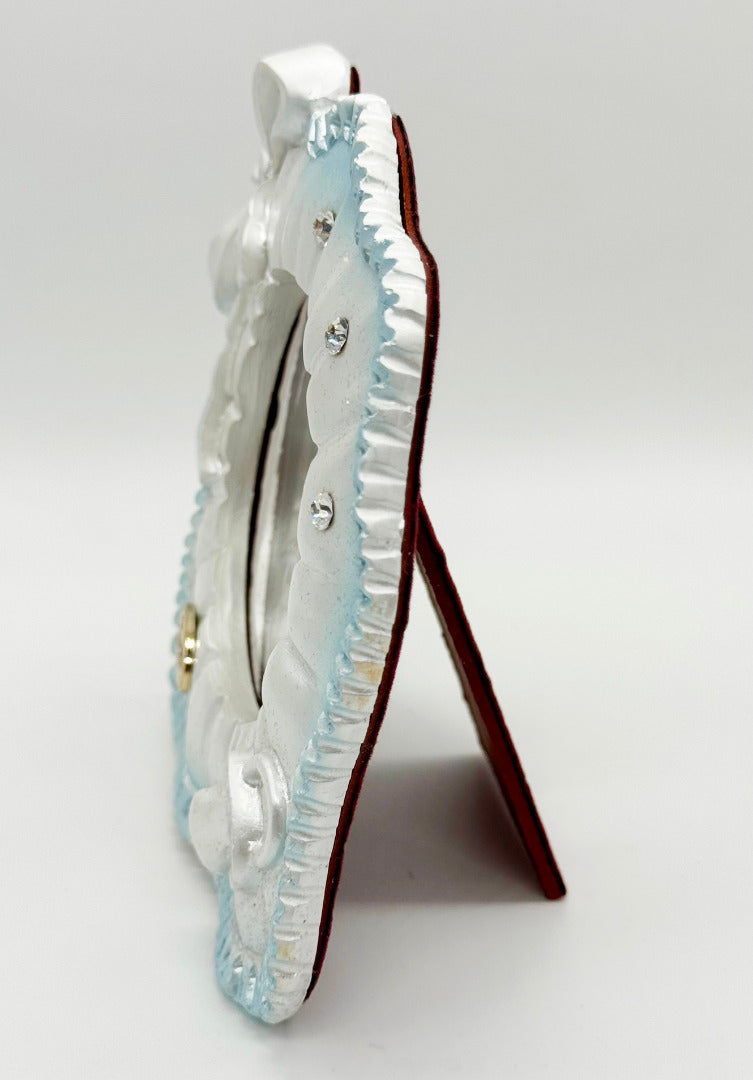 The delightful blue baby themed photo frame is embellished with three rhinestone crystals, and features a ribbon bow on the top and a baby's dummy on the bottom of the frame. With a red velvet easel back and rear-loading photo it measures 4½" x 4½" and will hold one circular picture sized 3" in diameter. Material: Resi