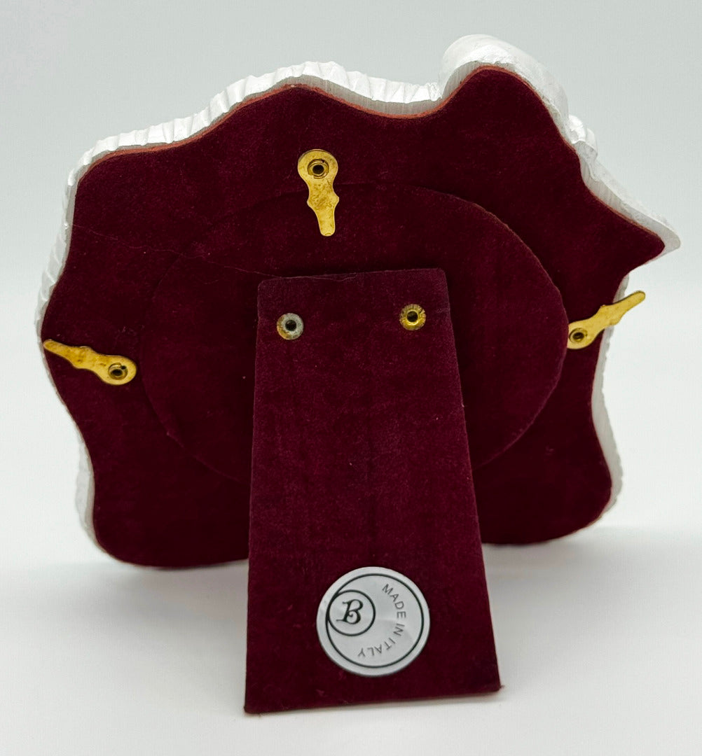 With a red velvet easel back and rear-loading photo it measures 4½" x 4½" and will hold one circular picture sized 3" in diameter.