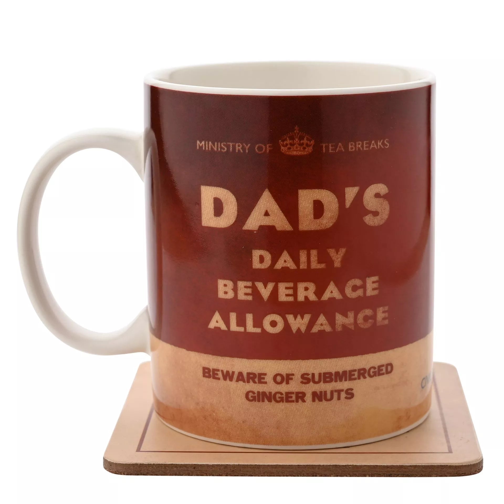 A Civil Defence Dad’s Daily Beverage Mug and Coaster Set by Harvey Makin®. The mug is made from durable stoneware and boasts a 325ml capacity. This set captures the true essence of 1940s advertisements, but with humour and vintage charm, and offers a playful twist on wartime propaganda.