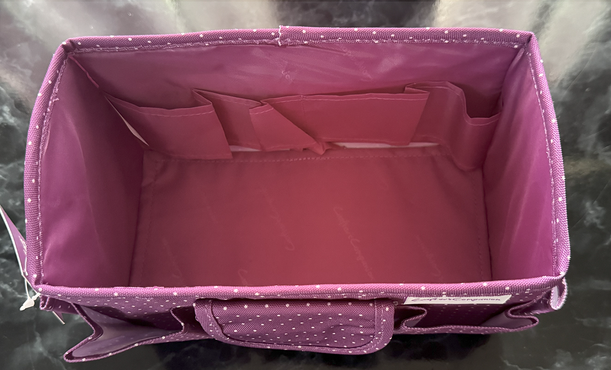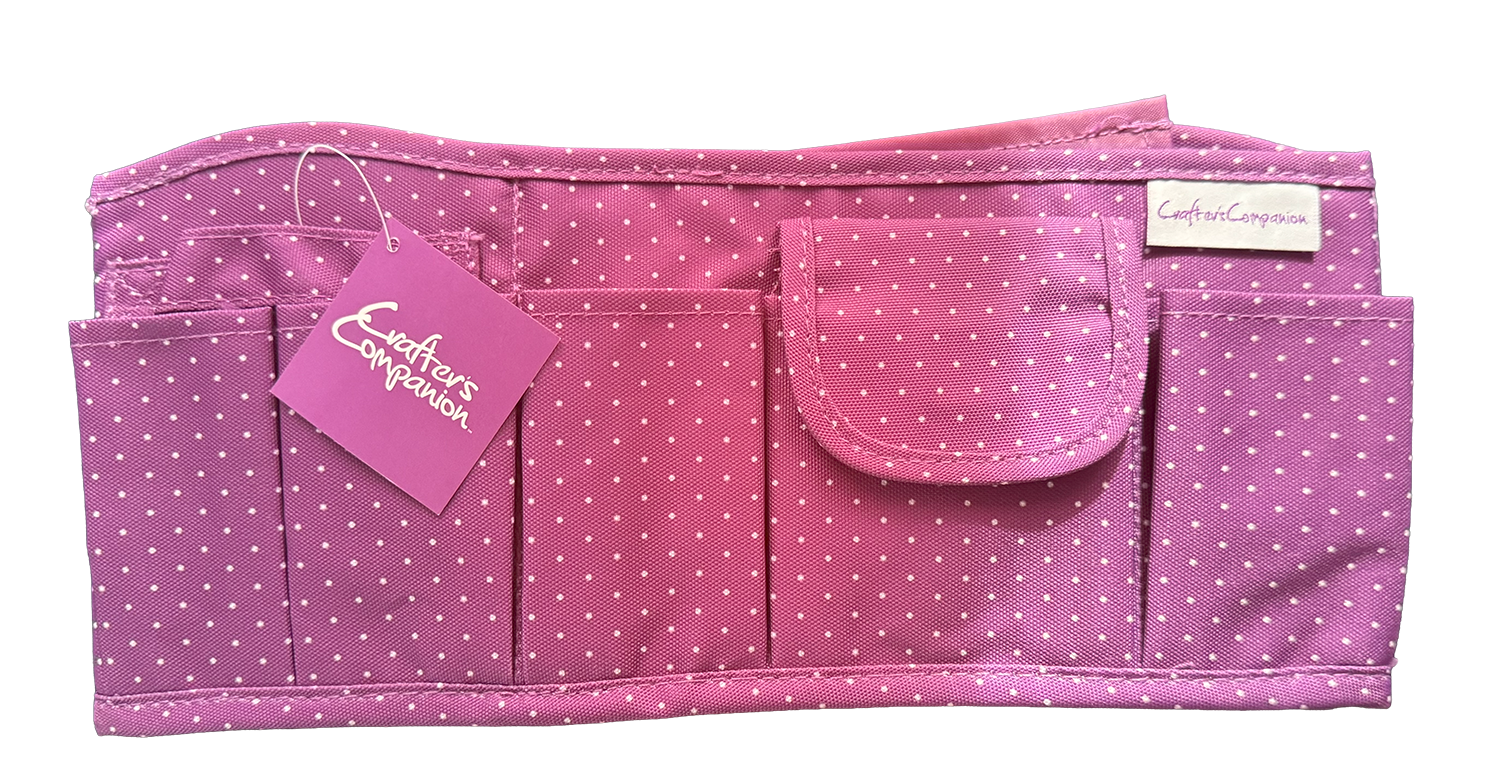 This Crafters Companion Purple Polka Dot Desk Storage folds flat for easy storage when not in use. It has two pockets on each end, and three pockets on the front. Inside there are a further pockets on the back. Size: 9" W x 4" D x 5" H