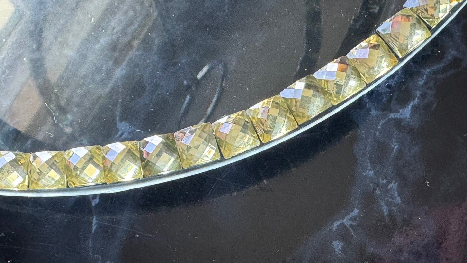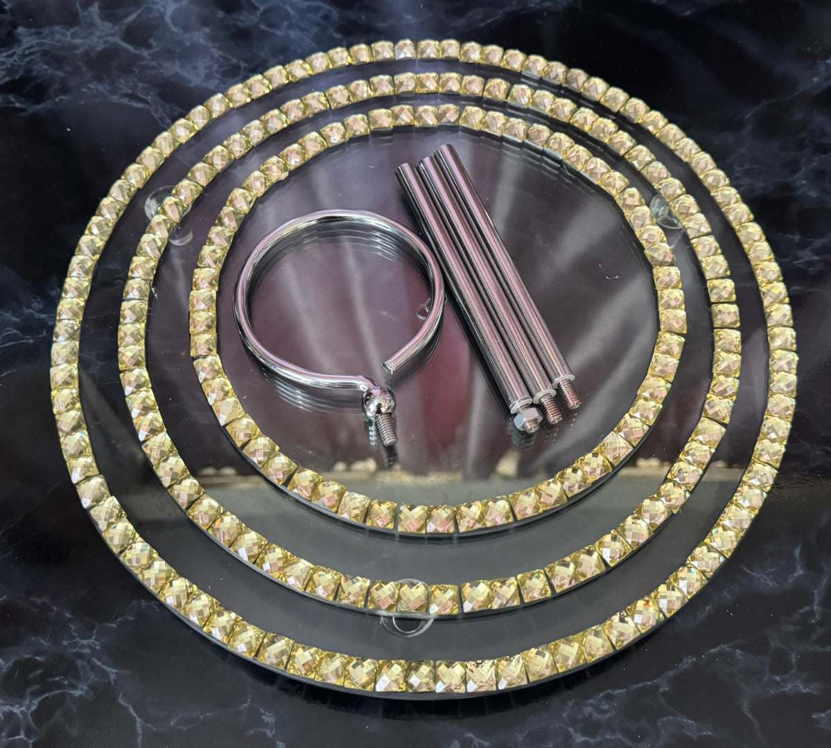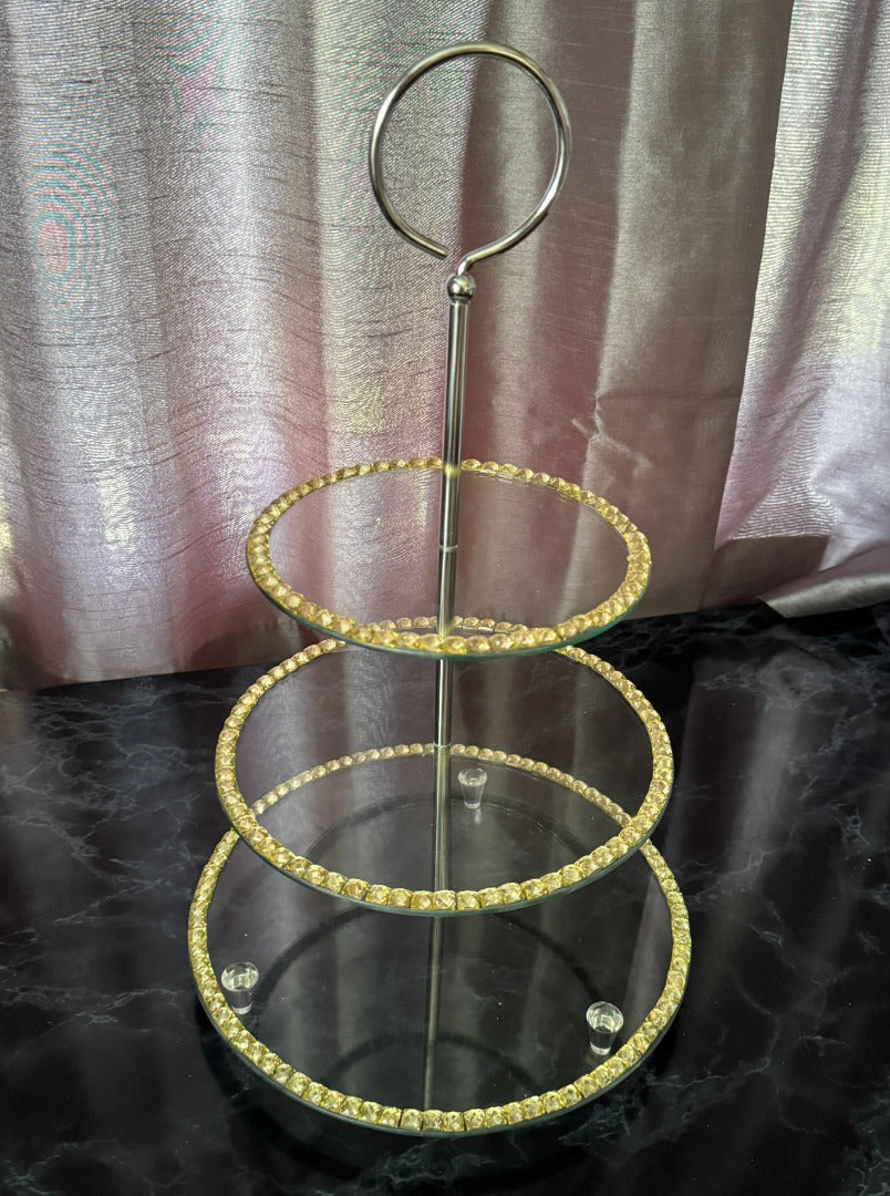 This decorative Glass Cake Stand has 3 tiers measuring 20cm, 25cm & 30cm in diameter Each glass layer is edged with gold coloured acrylic crystals Total height including handle approx. 50cm Can be used as a single, 2 or 3 tier stand