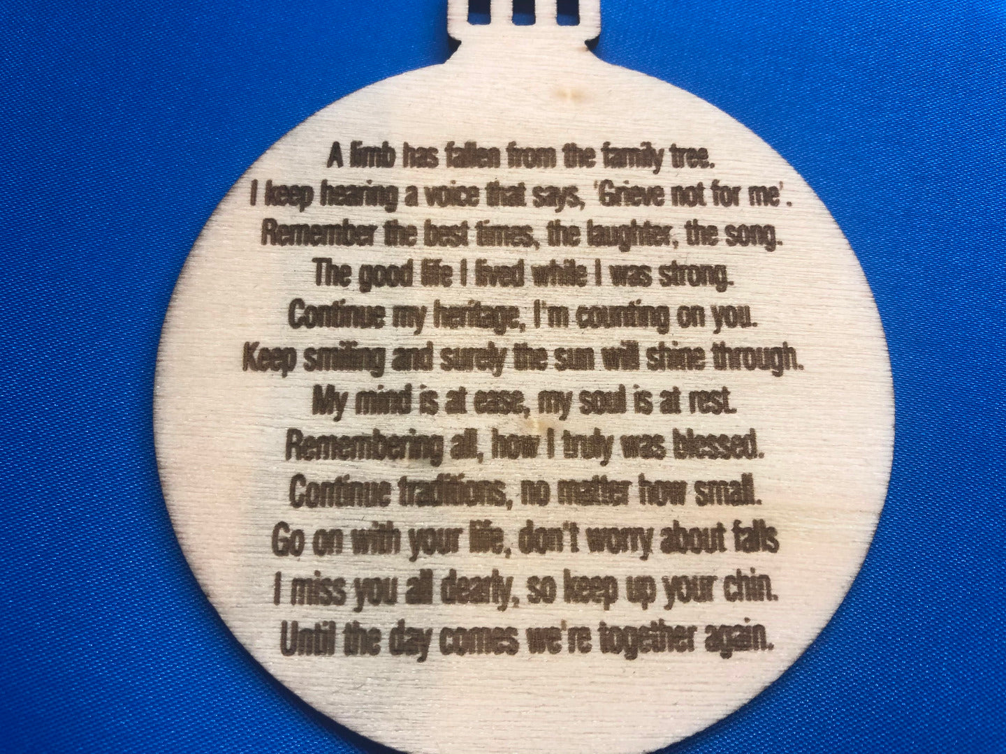 A natural wood tree decoration, personalised to commemorate a loved one.