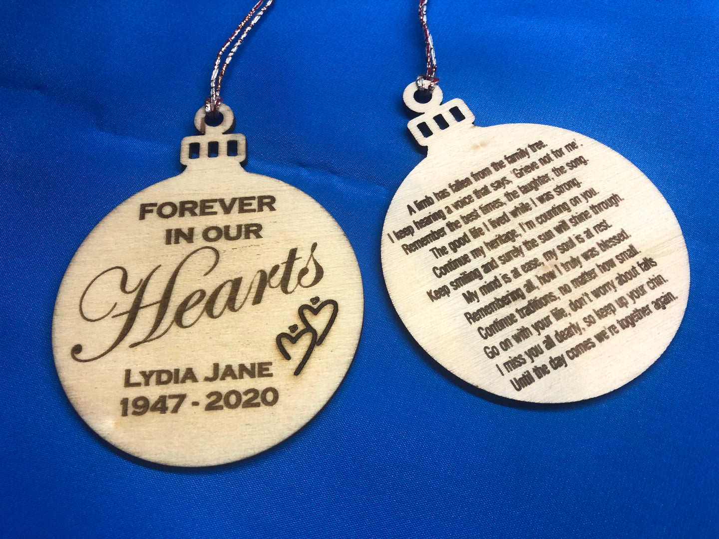 Forever in our Hearts Personalised Memorial Engraved Wooden Bauble Tree Decoration A natural wood tree decoration, personalised to commemorate a loved one. Bauble Size: 6.9cm diameter, 8.9cm tall. This tree decoration is laser engraved and can be personalised with a name and date. We can alter the text size to fit most
