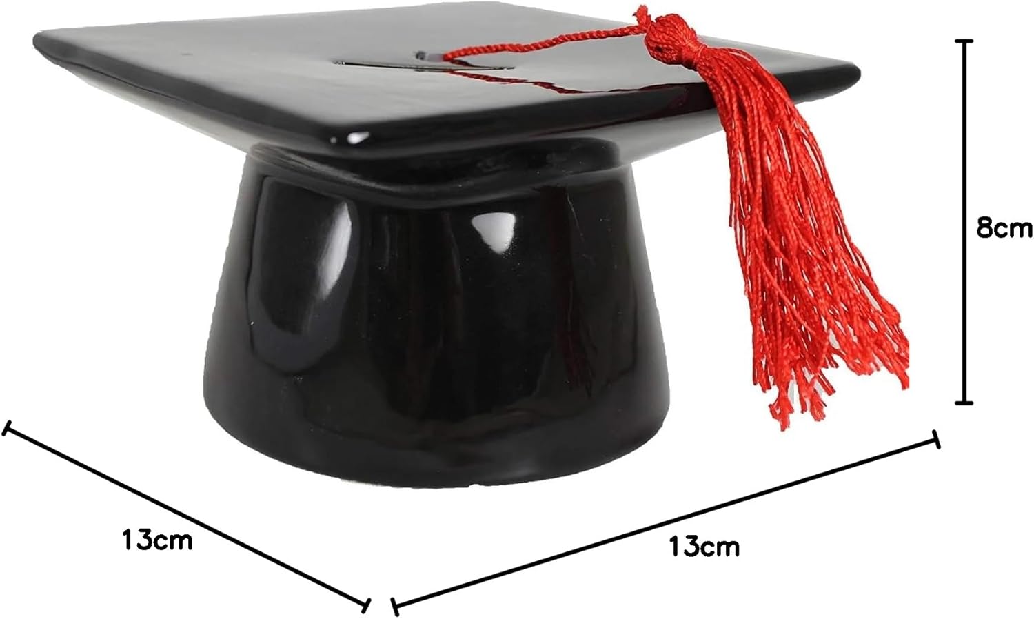 This graduation money box is a fun and practical gift for your favourite graduate. Ceramic mortar board hat design with red tassel The ceramic money box has a stopper in the bottom so that you can easily retrieve your cash Size: 13cm x 13cm x 8cm