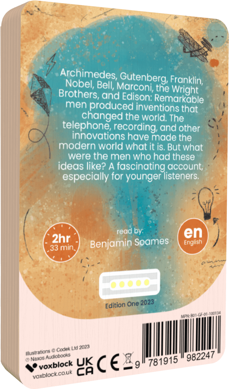 Archimedes, Gutenberg, Franklin, Nobel, Bell, Marconi, the Wright Brothers, and Edison: Nine remarkable men produced inventions that changed the world. The printing press, the telephone, powered flight, recording, and other innovations have made the modern world what it is. But what were the men who had these ideas and made realities of them like? As David Angus explains, they were very different: quiet, boisterous, confident, or withdrawn. But all had a moment of vision that they combined with single-minded determination to battle through numerous obstacles and produce something that really worked. This is a fascinating account, especially for younger listeners.