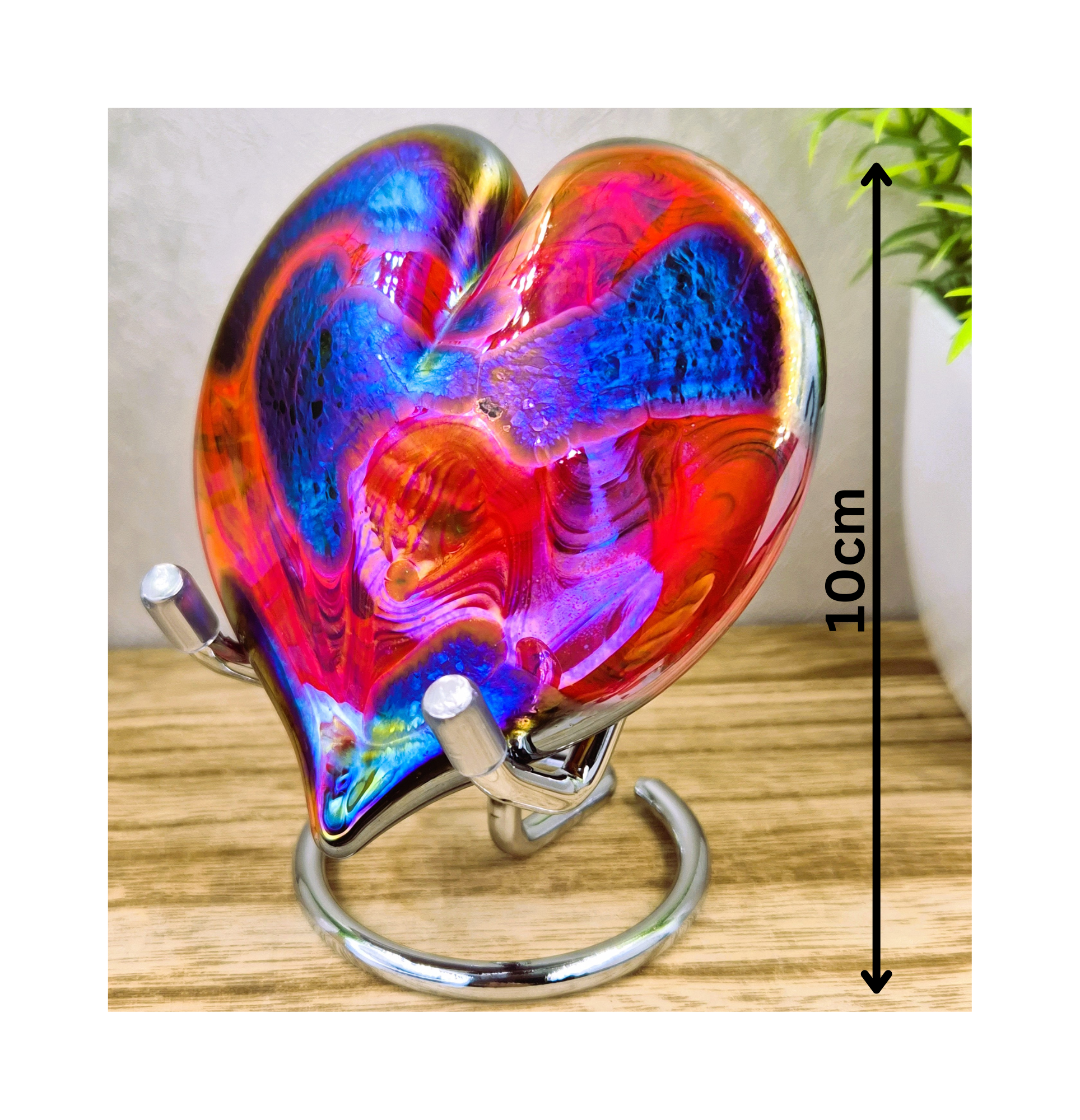 Handblown Art Glass Heart Shaped Ornamental Paperweights, finished with an iridescent glaze and felt pad base. Perfect for adorning your desk, gifting to a loved one, or adding to your collection. A stunning and unique piece of art glass that will be cherished for years to come. Specifications: * 8cm Across* Colours -