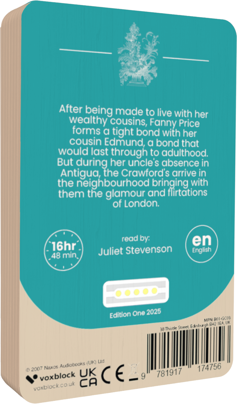 After being made to live with her wealthy cousins, Fanny Price forms a tight bond with her cousin Edmund, a bond that would last through to adulthood. But during her uncle's absence in Antigua, the Crawford's arrive in the neighbourhood bringing with them the glamour and flirtations of London.A Voxblock Audio Player is