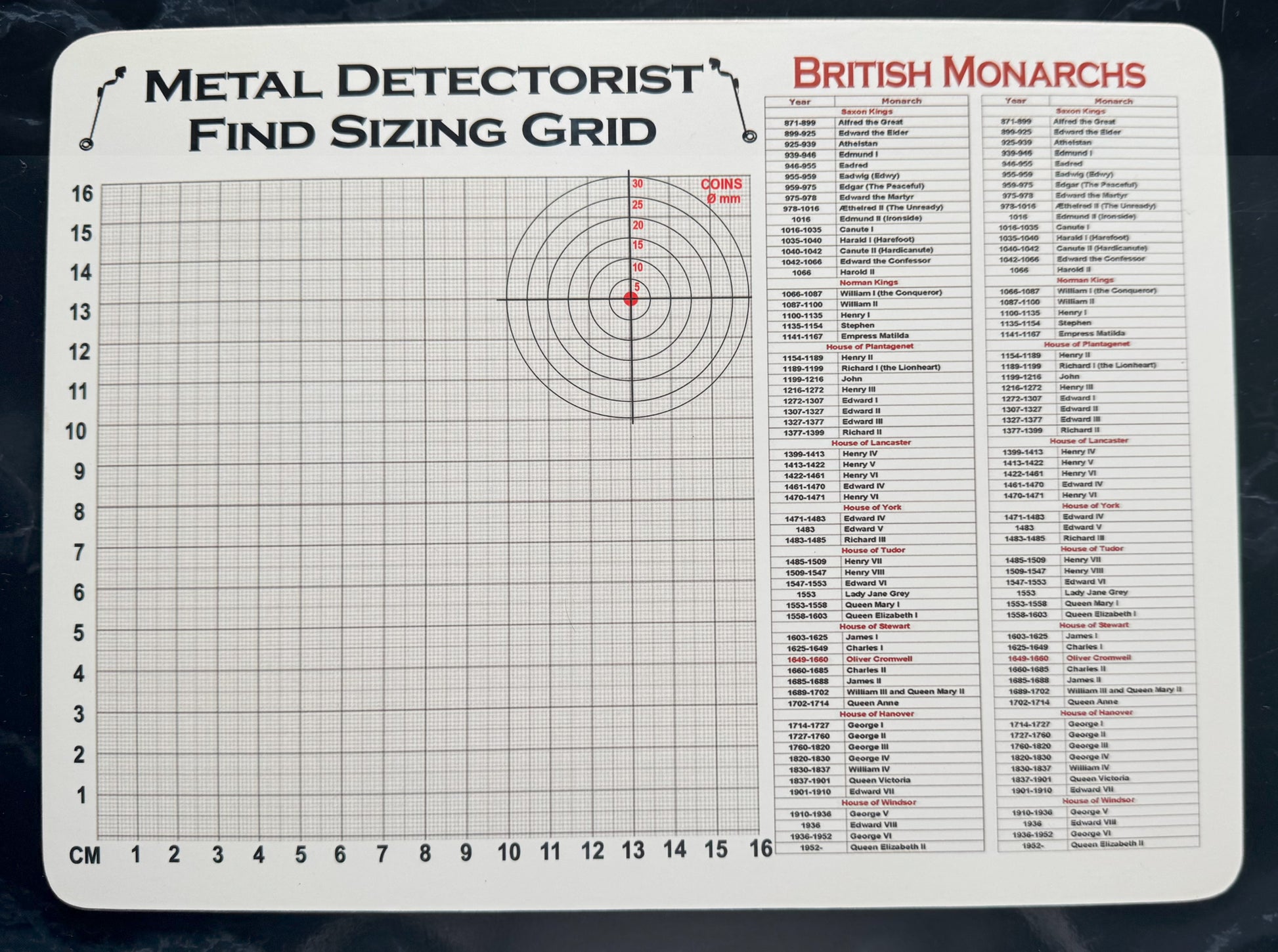 - These cork backed wooden boards are printed with a Metal Detectorist Find Sizing Chart and a list of British Monarchs
