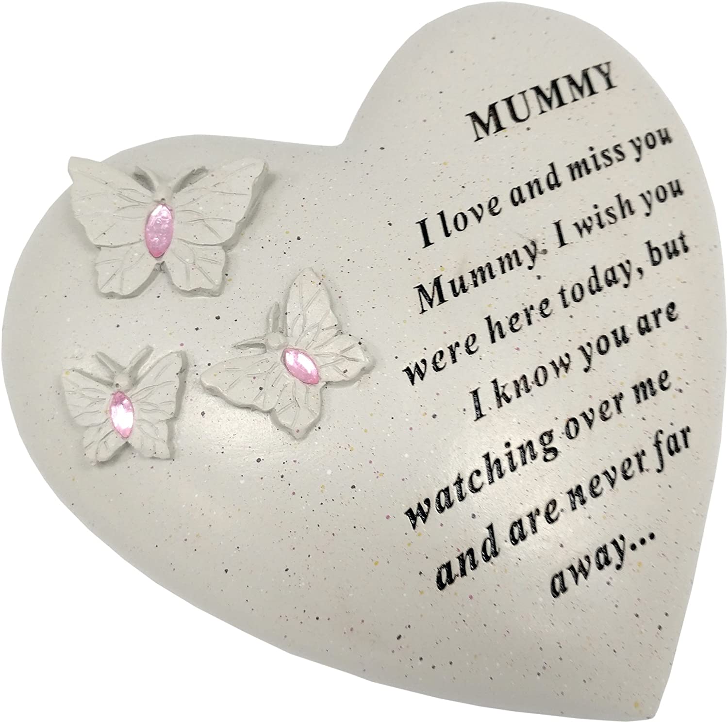 A beautiful memorial heart ornament plaque adorned with pretty butterflies with pink gemstones. To place by the graveside or at home in the garden. The heart reads; "MUMMY, I love and miss you Mummy. I wish you were here today, but I know you are watching over me and are never far away..." A graveside remembrance memo