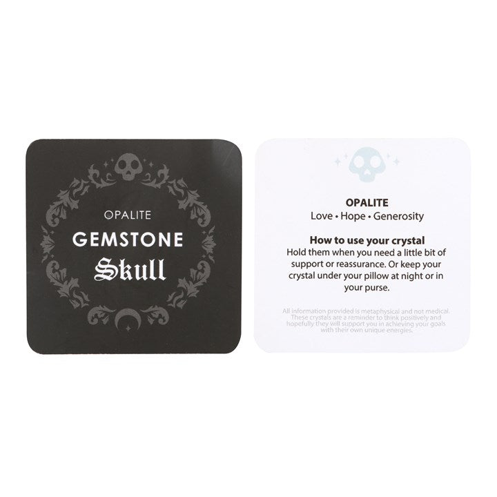 This crystal skull is made from opalite which is a stone renowned for its ability to evoke feelings of love, hope, and generosity. The skull is the perfect size for holding in the palm of your hand then you need a little support or reassurance. This unique piece serves as a stylish desk accessory, always within arm's r
