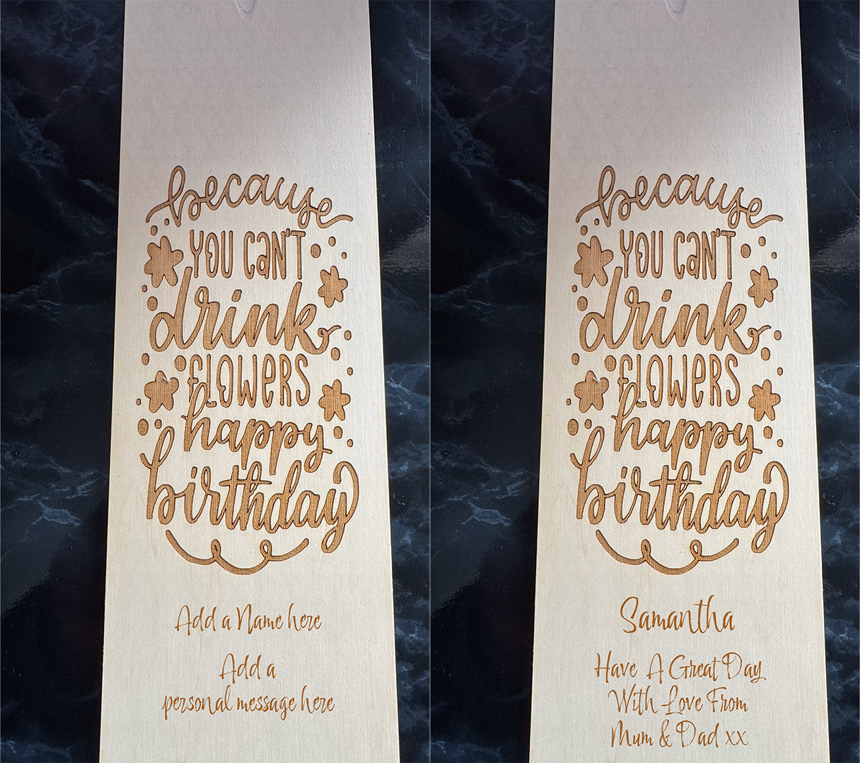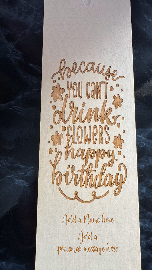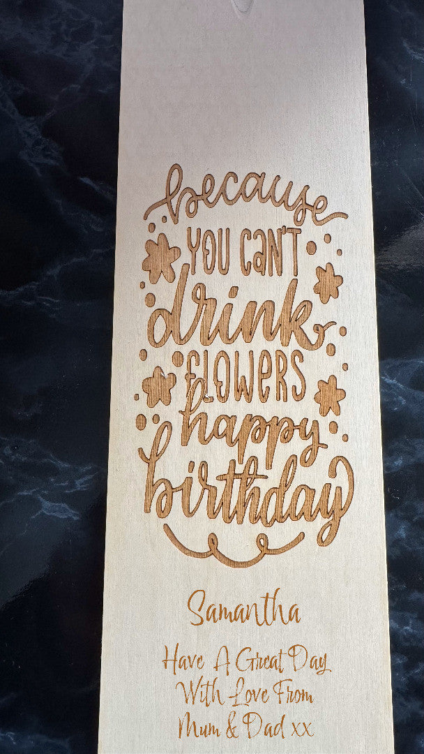 The box lid is engraved with a Birthday message and can be personalised with a Name and short message at the bottom.