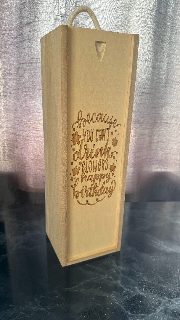 Personalised Wooden Wine Box with Rope Handle, holds a single bottle (not included). The box lid is engraved with a Birthday message and can be personalised with a Name and short message at the bottom. Box Dimensions: External: 10cm D x 11cm W x 36cm H Internal: 9cm D x 9cm W x 33.5cm H