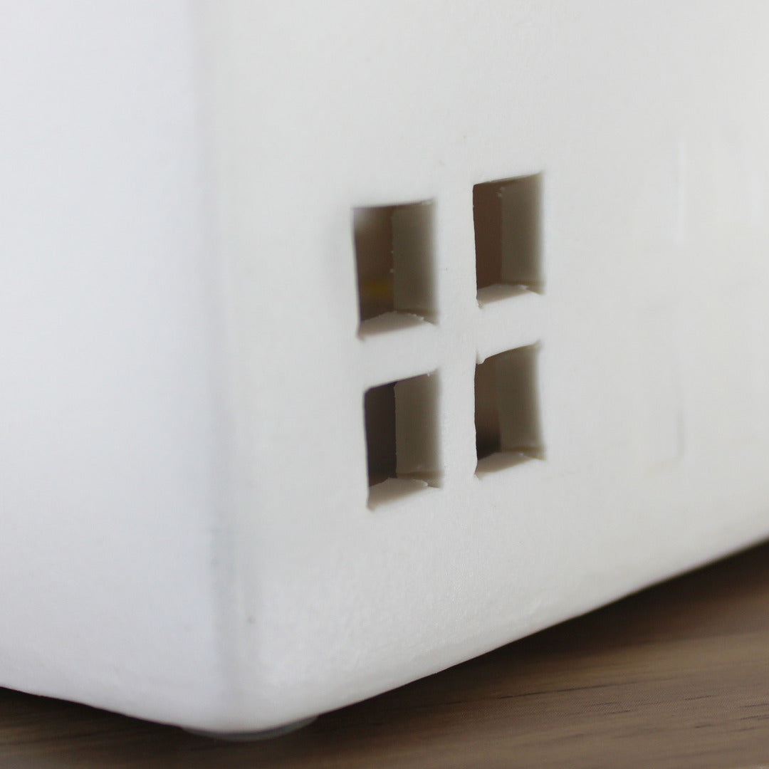 Measuring 13cm wide, 10cm tall and 7.5cm deep, the house is perfectly sized for a mantelpiece, shelf or windowsill. It features a simple on/off switch at the base for easy use.