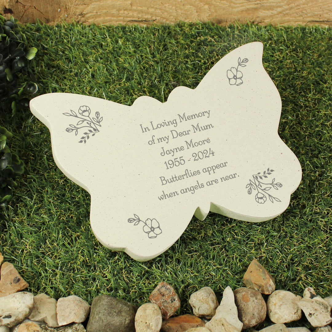This is a beautiful way to remember a loved one. Size: 17cm x 22cm x 8cm Personalise this memorial butterfly with 6 lines of text, with up to 30 characters per line. Personalised to order - Despatched normally within 1-3 working days. Please double check your personalisation - how you type it will be how it appears
