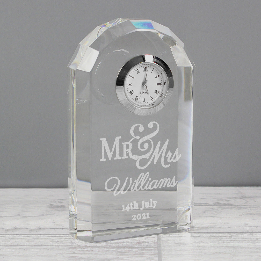 This beautiful Mr & Mrs Crystal Clock is an ideal gift as a reminder of the special moments from their big day.