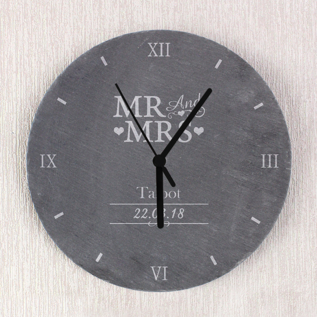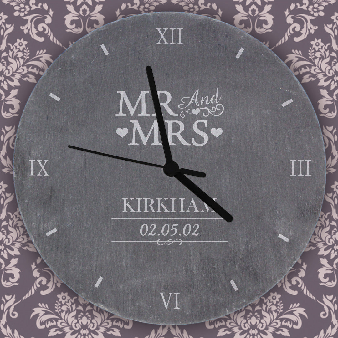 A rustic slate clock, ideal for someone who has just bought a New Home or for the lucky couple who have just got married! This clock requires 1 x AA battery (Battery not included). Clock size: approx 24cm Diameter How to personalise this clock: The words 'MR And MRS' are fixed. You can add a surname up to 15 characters