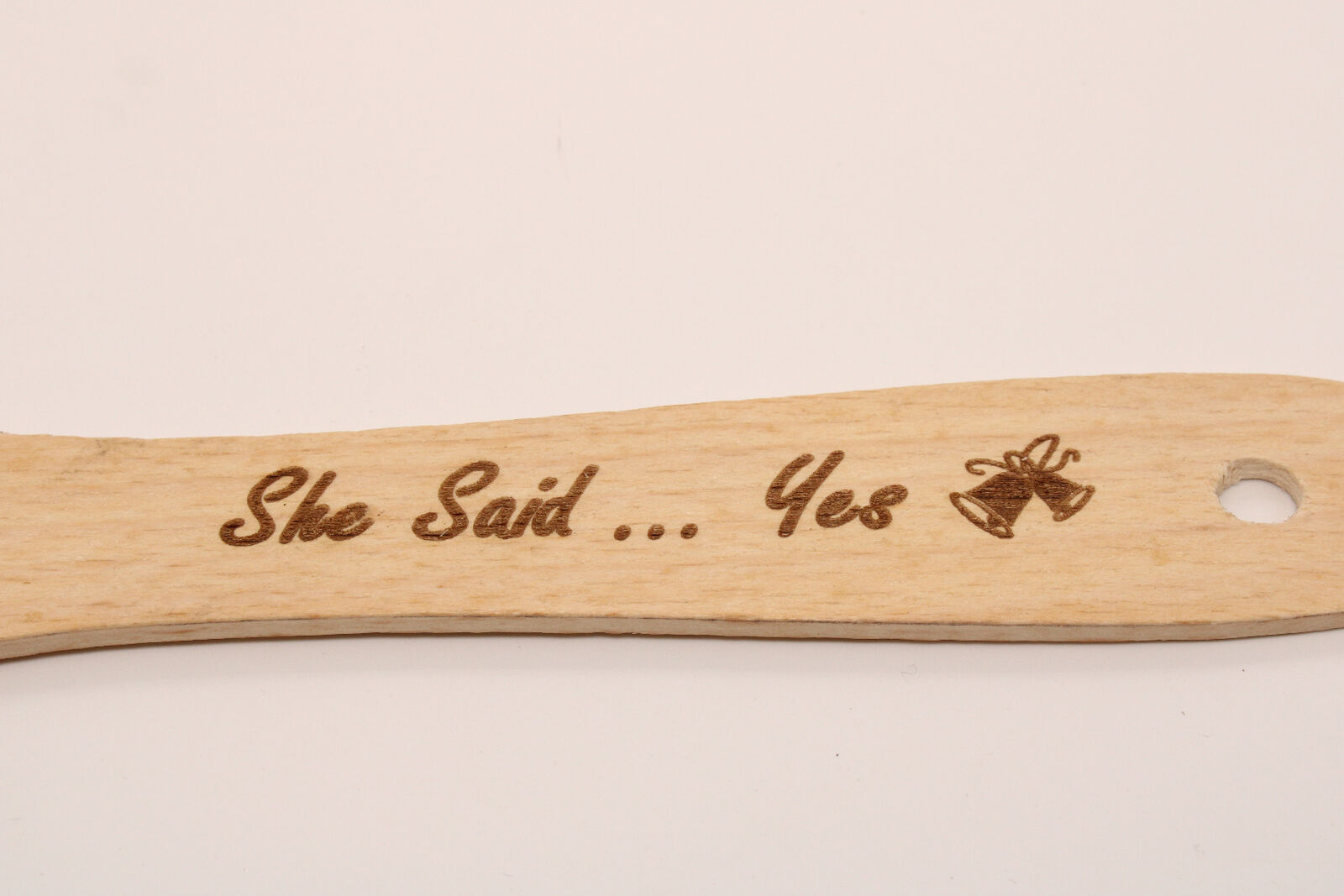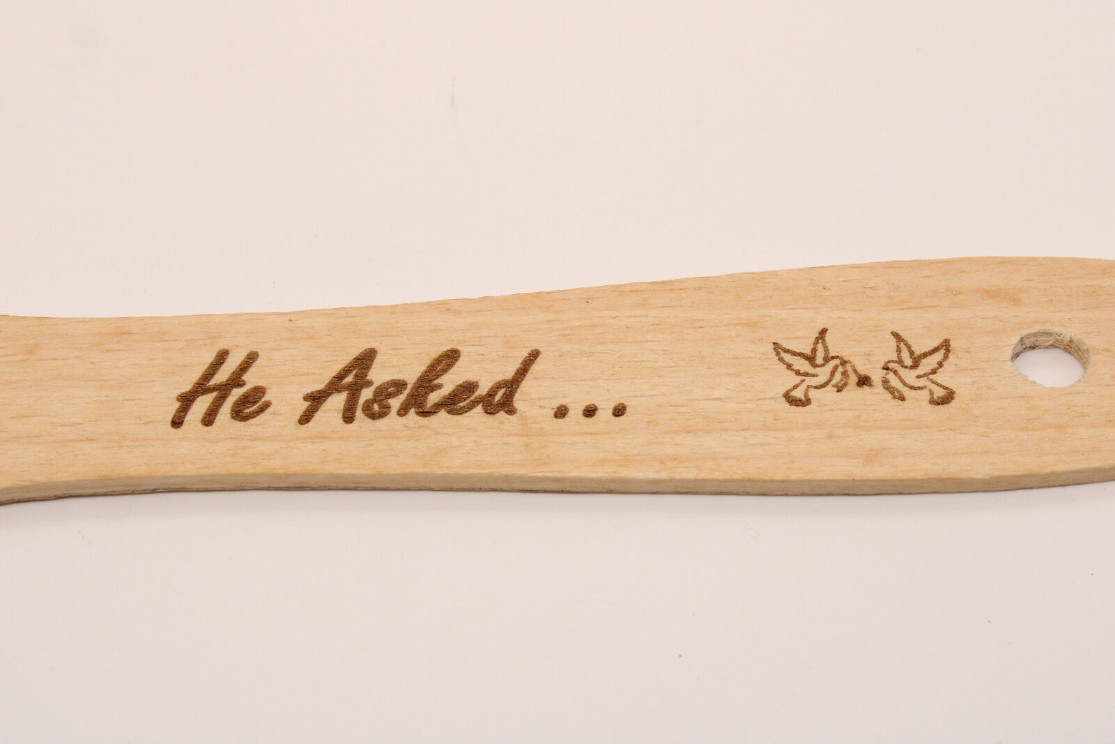 Personalised Wooden Wedding Spatula - 'He Asked .. She Said Yes'Made from beech wood, these spatulas measure 28cm in length and are engraved with 'He Asked ...' on one side of the handle, and 'She Said ... Yes' on the other side.The text can be reversed to read 'She Asked' and 'He Said', or 'He & She' can be replac