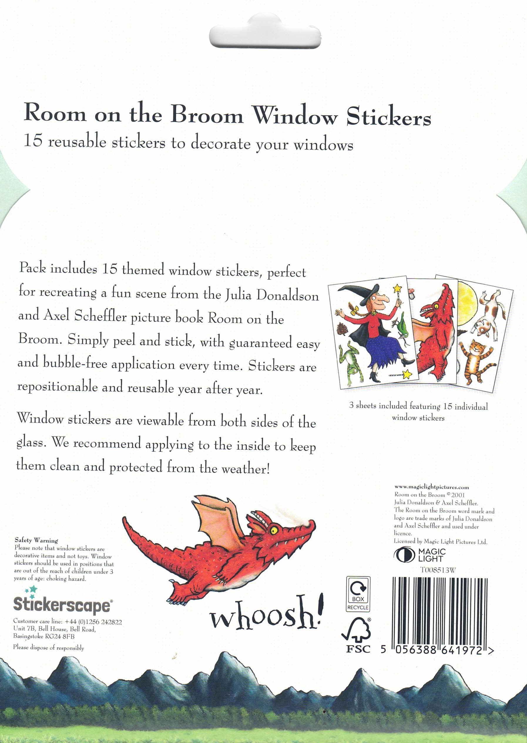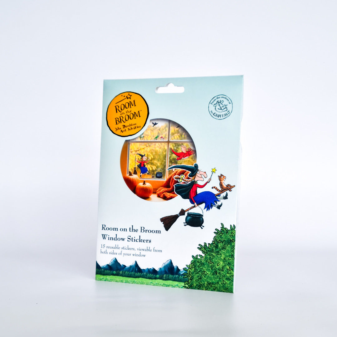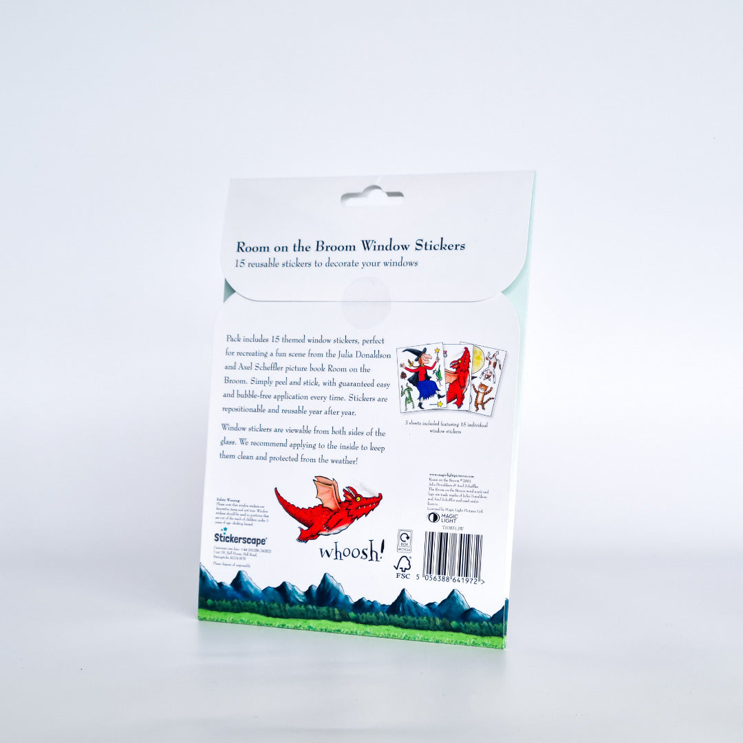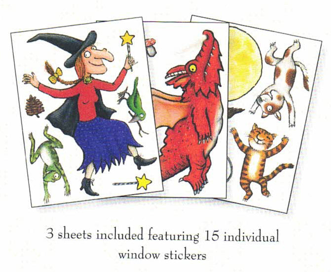 This window sticker set features the famous scene from the hit book Room on the Broom, with the Witch, Dog, Cat, Frog and Bird all aboard the super duper broomstick.
