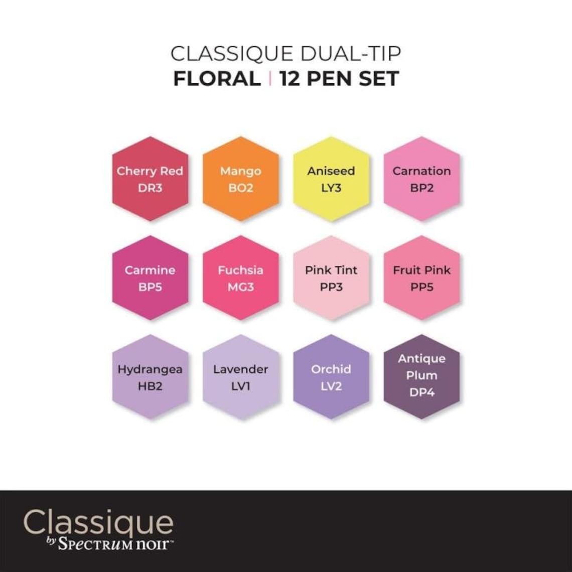 Spectrum Noir Classique (12PC) - FloralDual-tipped with the classic combination of broad-chisel and fine-bullet nibs, Classique markers from Spectrum Noir are the everyday go-to for a vast range of creative applications. Use them for everything from illustration and sketching through to professional design. With perfor