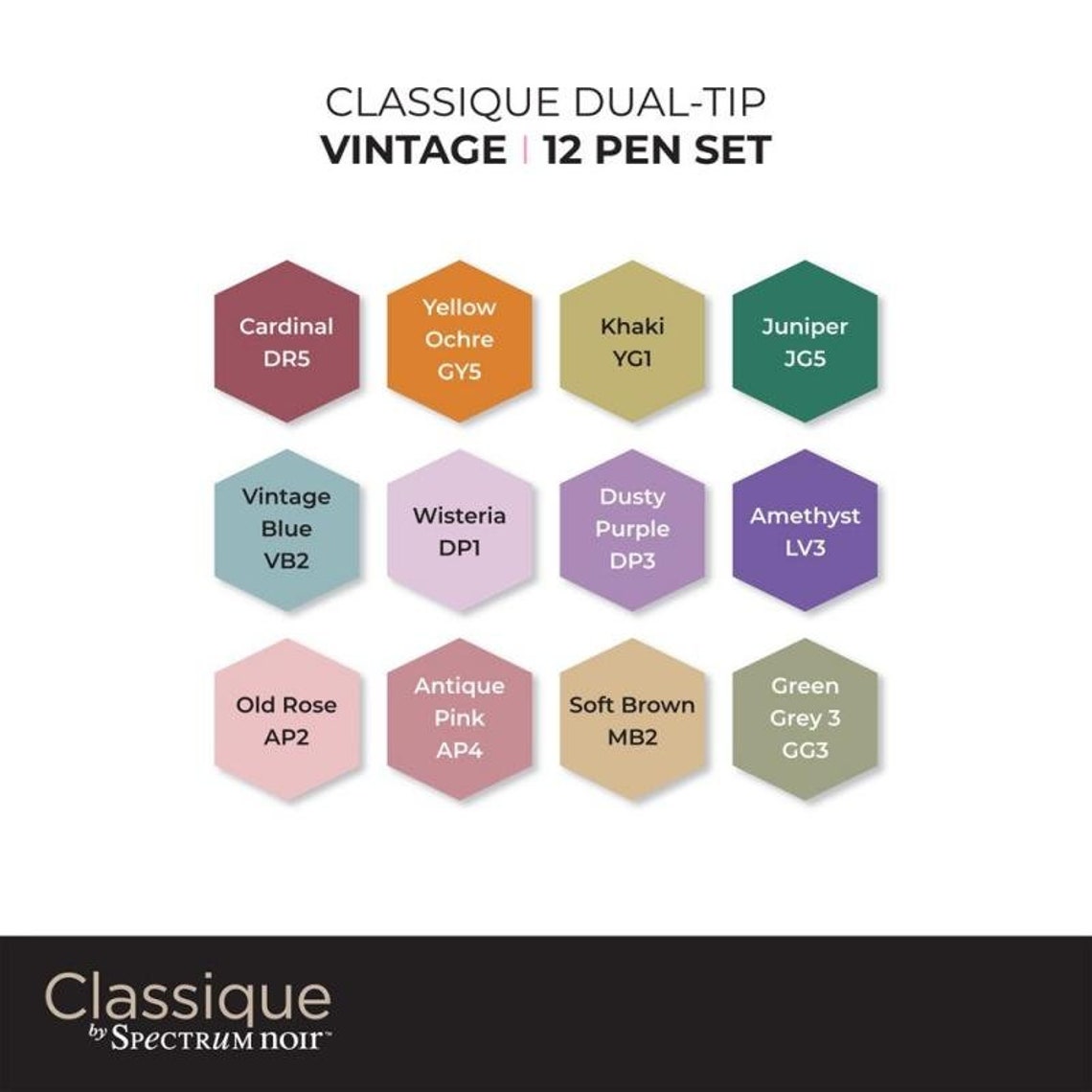 Spectrum Noir Classique (12PC) - VintageDual-tipped with the classic combination of broad-chisel and fine-bullet nibs, Classique markers from Spectrum Noir are the everyday go-to for a vast range of creative applications. Use them for everything from illustration and sketching through to professional design. With perfo