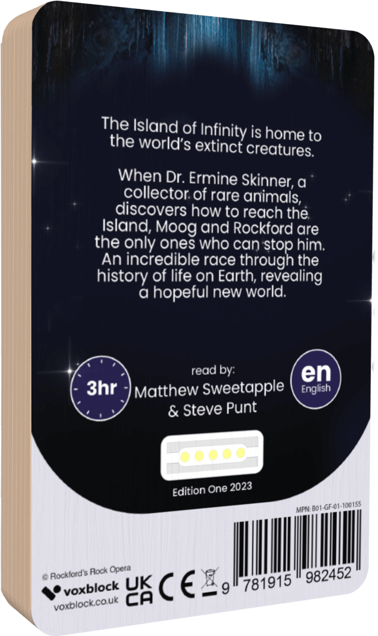 The Island of Infinity, a sanctuary for extinct species, faces a threat from Dr. Ermine Skinner, a collector of rare animals. When Dr. Ermine Skinner, a collector of rare animals, discovers how to reach the Island, Moog and Rockford are the only ones who can stop him. Listen as the duo race through the history of life
