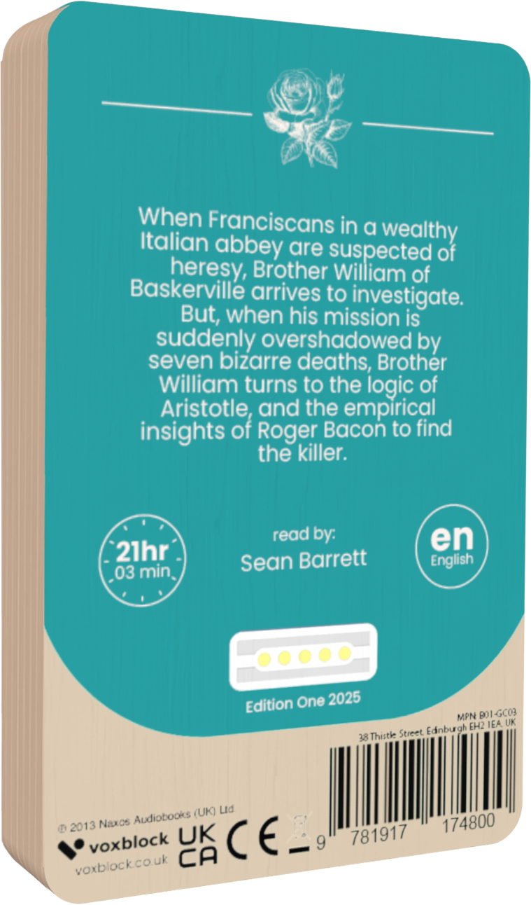 When Franciscans in a wealthy Italian abbey are suspected of heresy, Brother William of Baskerville arrives to investigate. But, when his mission is suddenly overshadowed by seven bizarre deaths, Brother William turns to the logic of Aristotle, and the empirical insights of Roger Bacon to find the killer. A Voxblock Au