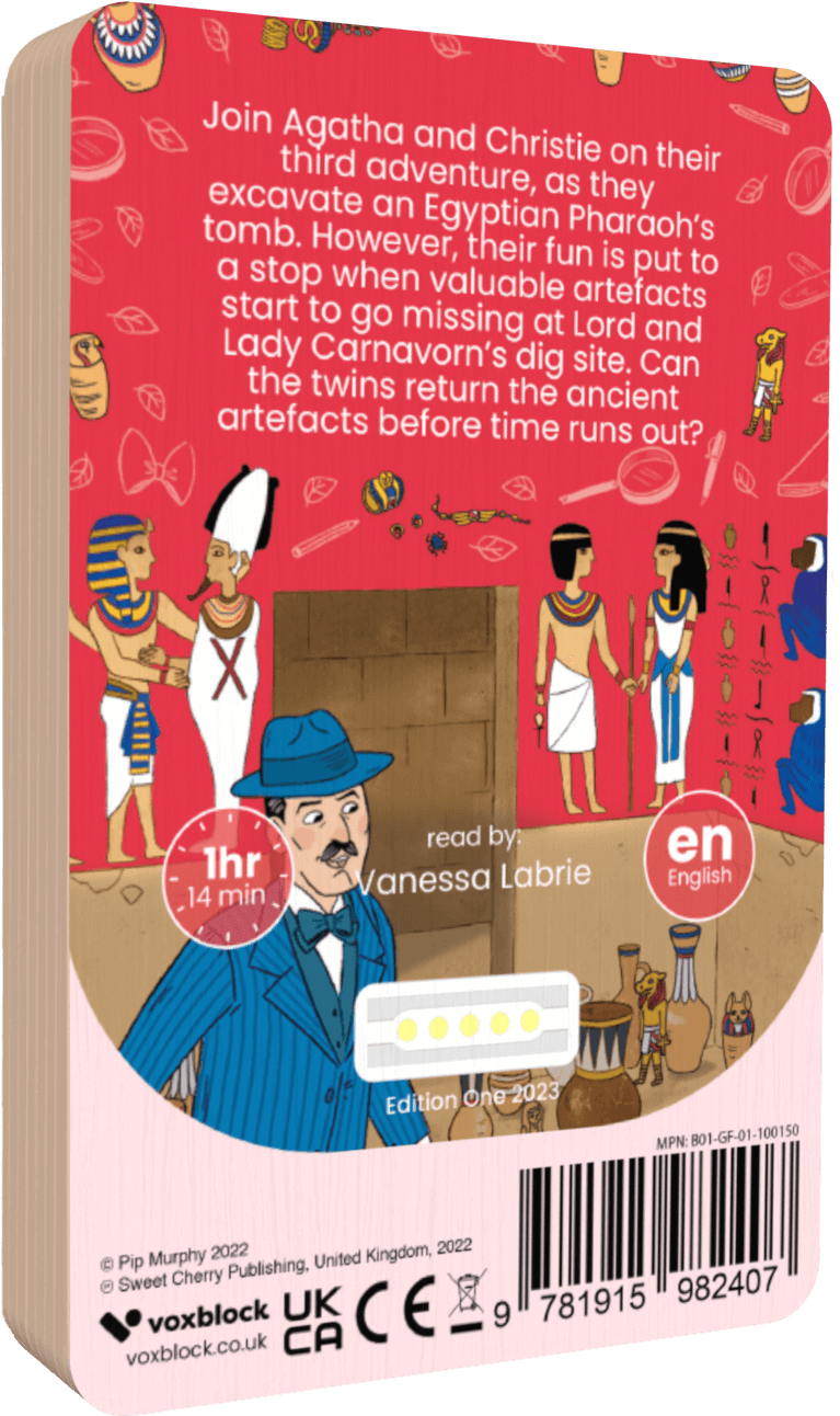 Join Agatha and Christie, two twin sisters, on their third thrilling adventure. This time, they're exploring an ancient Egyptian Pharaoh's tomb. They're having a great time until they realise something terrible has happened: important artefacts from the excavation site managed by Lord and Lady Carnavorn are disappearin