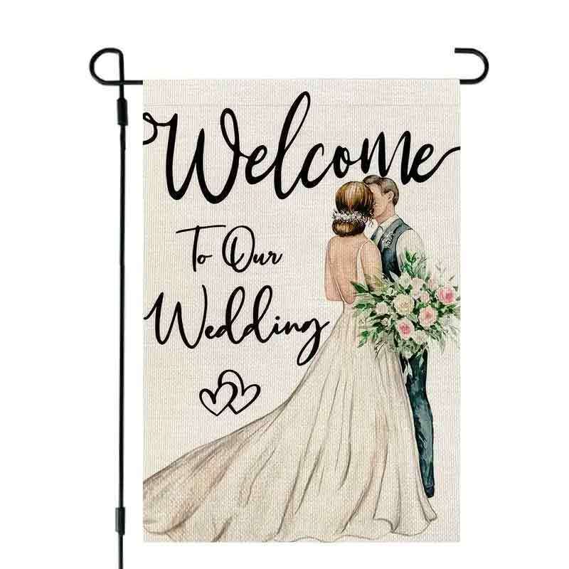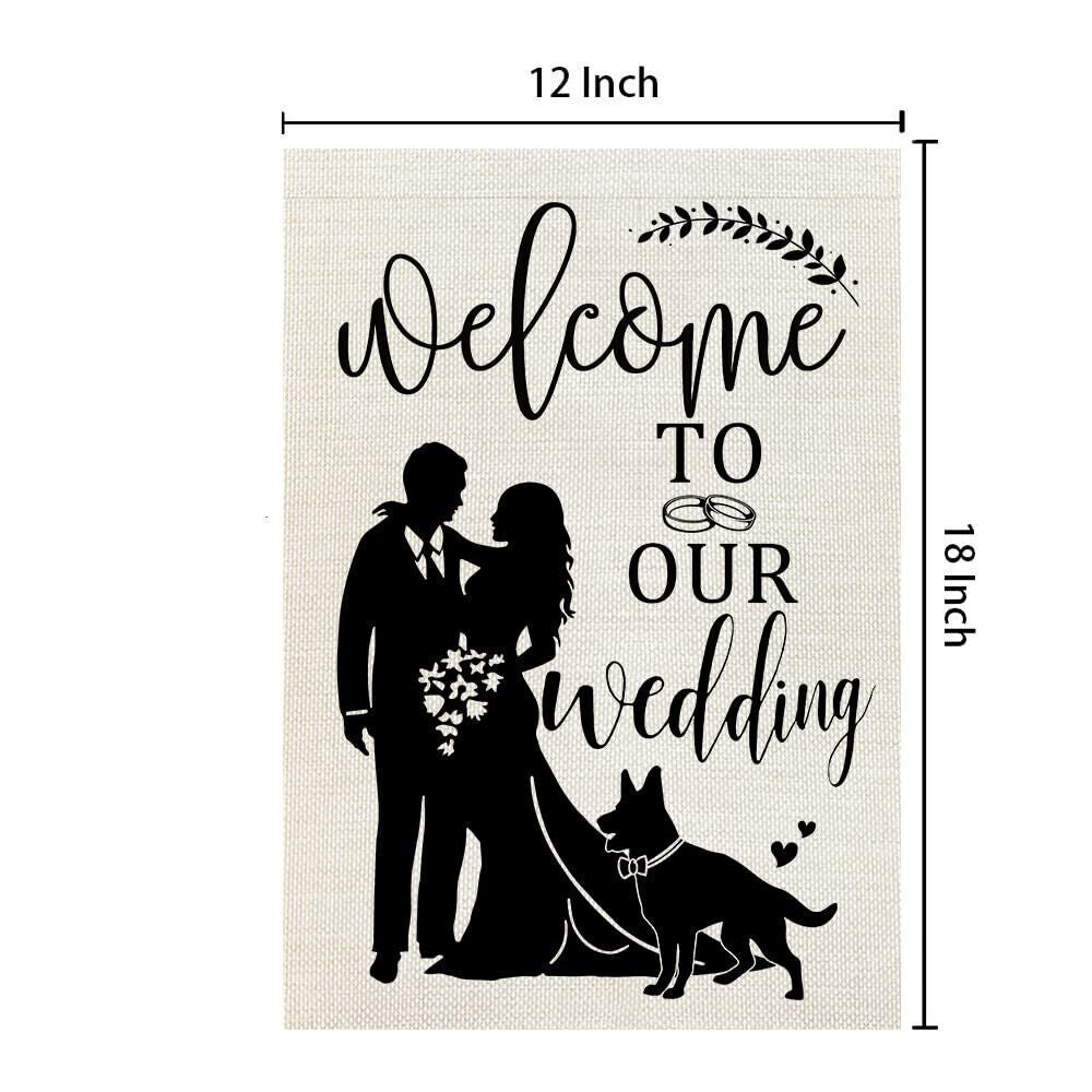 'Welcome To Our Wedding' garden flag - Choice of designs available. The size is 12x18 inch, fits most standard Flag Stands. These durable outside Wedding flags are made of burlap looking machine washable Spun Polyester, which is weather resistant as well as UV / fade-resistant. Printed on both sides, the image is vibra