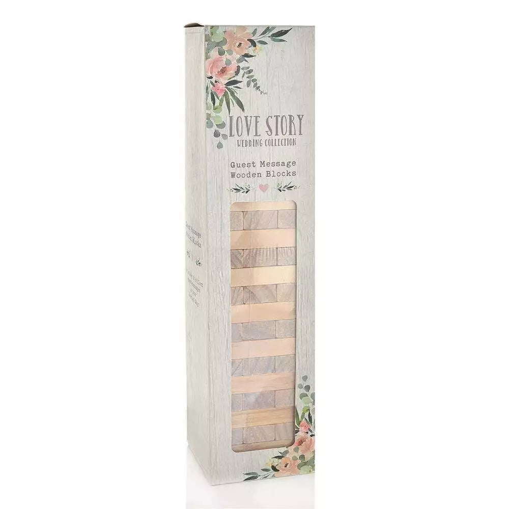 Wooden Wedding Guest Message Blocks from Widdop & Co. Add a fun twist to the classic wedding guest book with this Jenga style guest book game. These wedding guest message blocks evoke the rustic charm of the quintessential barn wedding. - Natural finish wooden blocks - 72 piece wooden block game - A quirky and fun