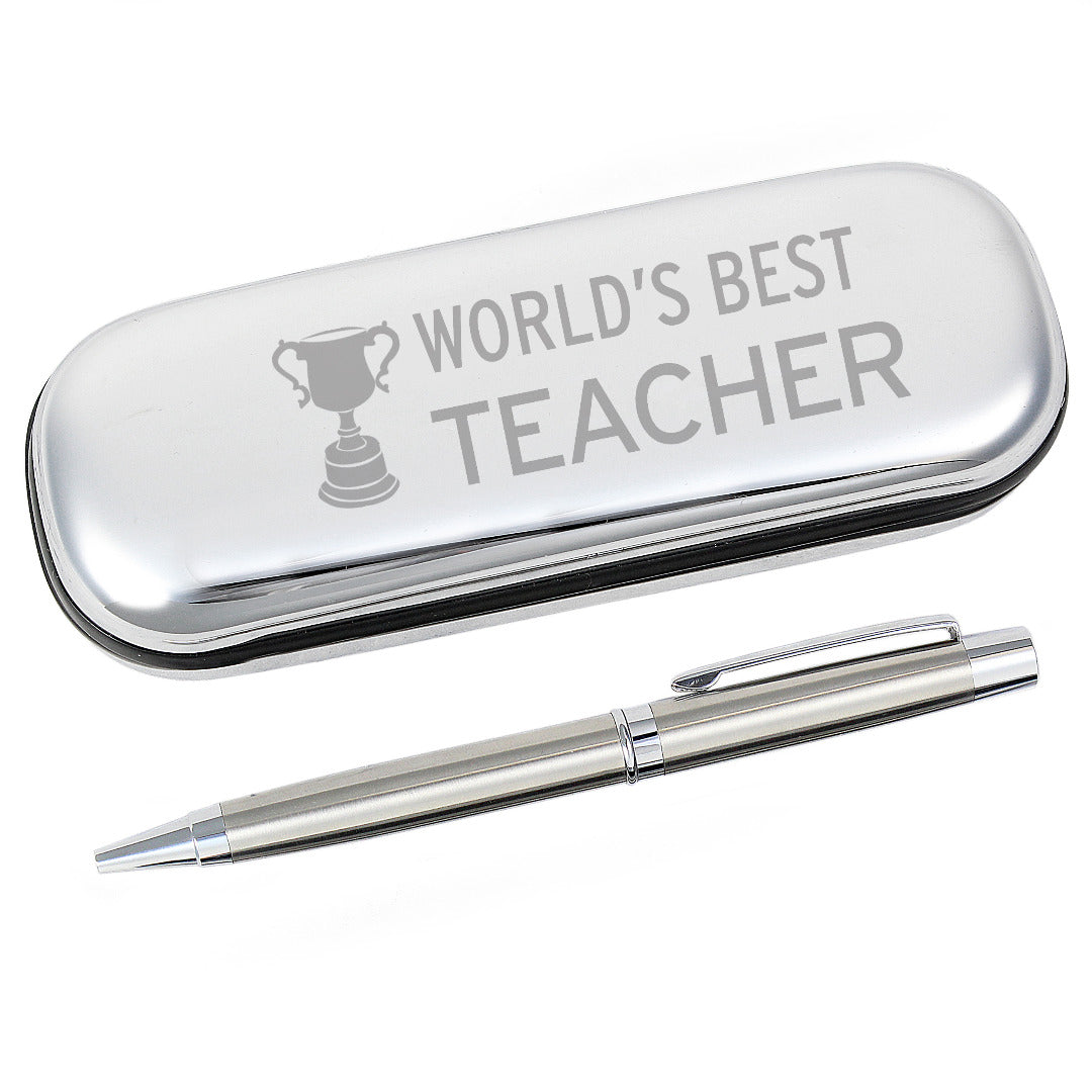 This set includes a ball point pen and box and features a trophy motif. The wording 'World's Best Teacher' is standard text. The inside of the pen box is lined. Pen measures 14cm x 1cm