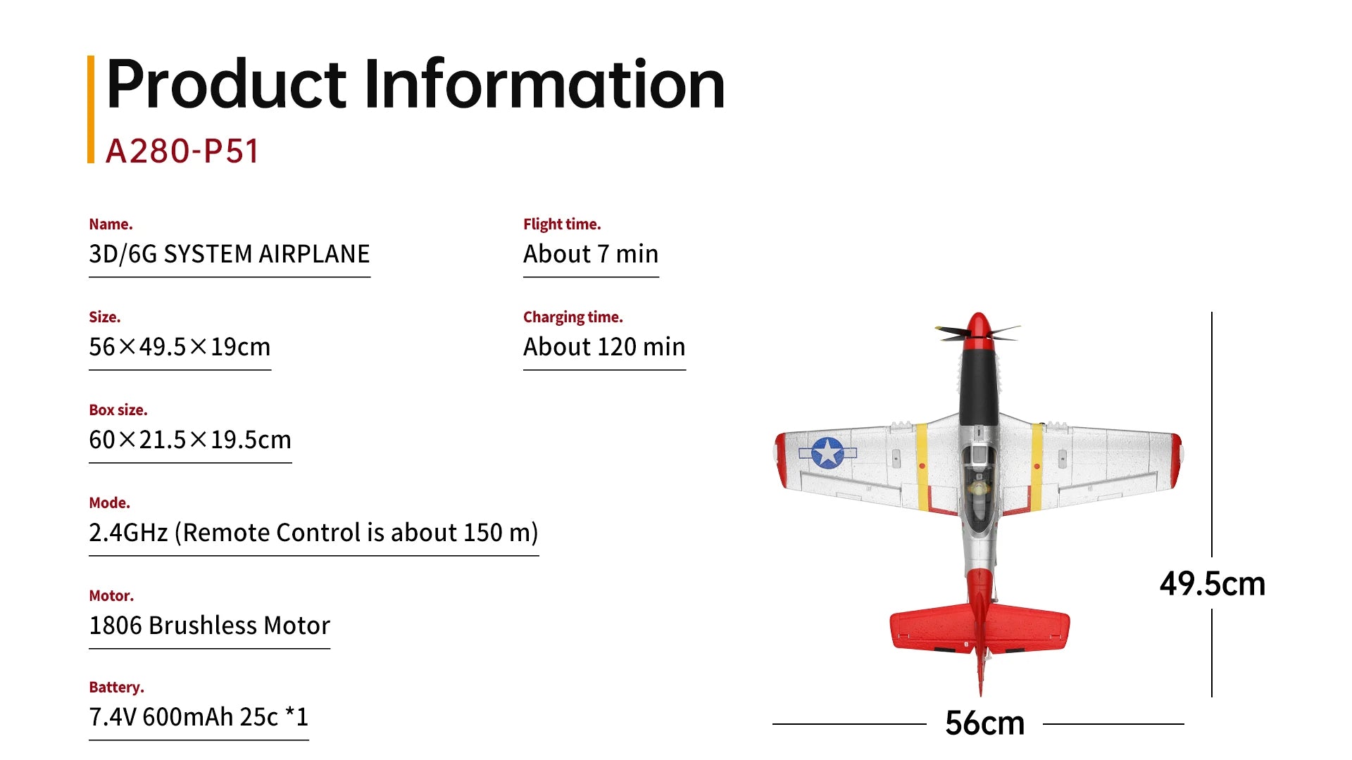Take your love of aviation to the next level with the XK A280 RC Plane, a high-performance P51 fighter simulator designed for children and adults alike. Featuring 4-channel controls, 3D6G mode for stable or advanced flying, and a built-in LED searchlight, this remote control airplane combines thrilling aerobatics with